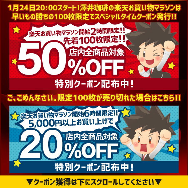 1月24日20:00スタート!澤井珈琲の楽天お買い物マラソンは早いもの勝ちの100枚限定で!! スペシャルタイムクーポン発行で!!なんと!! \50%OFFクーポン発行!!/ のタイムセールをご用意!! ※楽天市場のクーポンシステムの都合上、取得は無制限で取得できますが、 ご利用頂けるのは先着100枚限りとなっております。